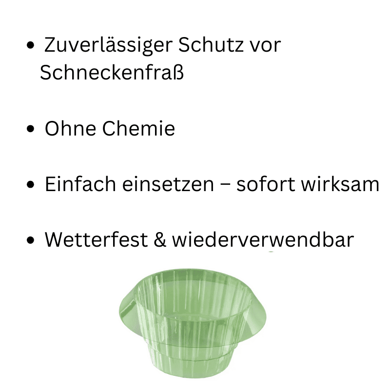 Der Schneckenschutzring wird einfach um die Pflanze gesetzt und leicht in die Erde gedrückt. Die glatte, speziell geformte Barriere ist für Schnecken kaum zu überwinden und hält sie zuverlässig vom empfindlichen Pflanzenherz fern – ganz ohne Chemie 🌱