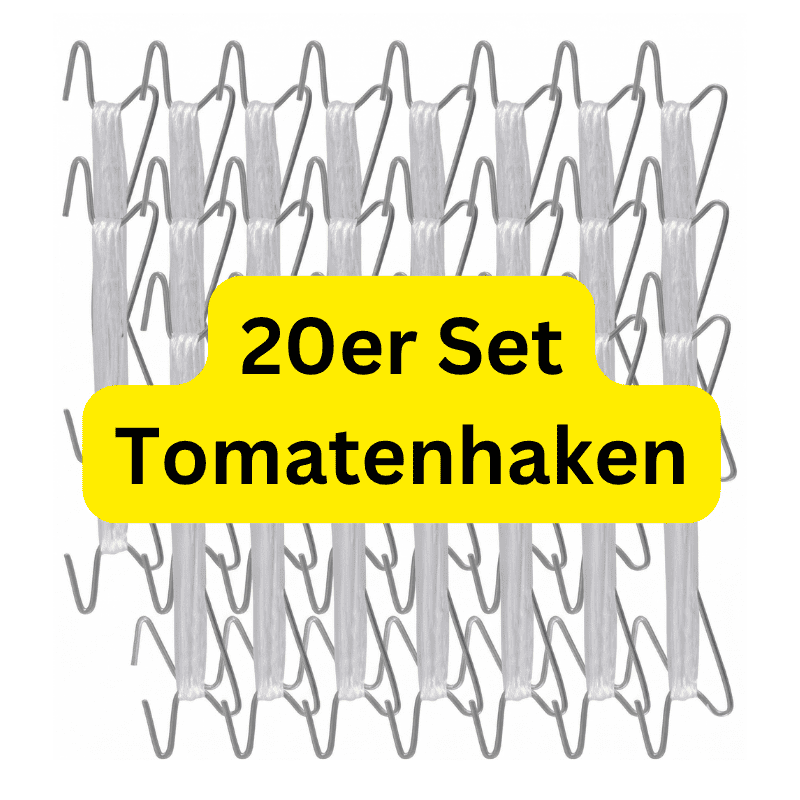 🔹 Tomatenhaken 20er-Set mit Schnur – Die gleiche Rankhilfe, die in professionellen Gewächshäusern eingesetzt wird. Haken oben einhängen, Schnur ablassen, Pflanze hochwickeln. In Sekunden befestigt, kein Draht, kein Knoten. Und wenn die Pflanze oben angekommen ist? Einfach Schnur ablassen, Pflanze tiefer legen, weiter ernten. So holst du bis zu 30 % mehr Ertrag aus jeder Pflanze.