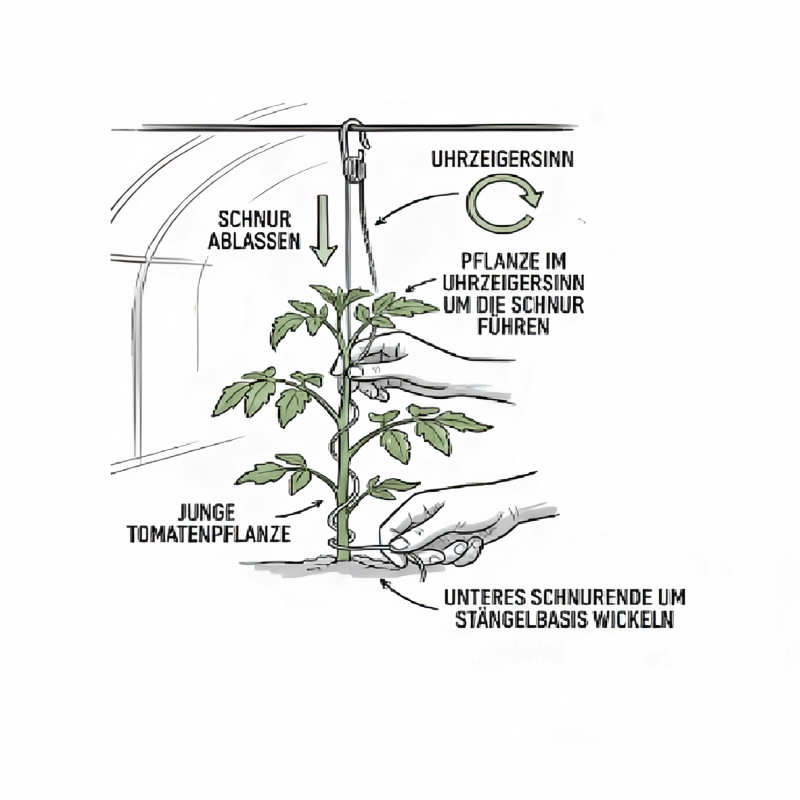 Profi-Tipp für beste Ergebnisse: Wickeln Sie den Haupttrieb der Pflanze immer im Uhrzeigersinn um die Schnur. Dies entspricht dem natürlichen Windungsverhalten der meisten Kletterpflanzen und sorgt für stabilen Halt ohne Einschnüren.